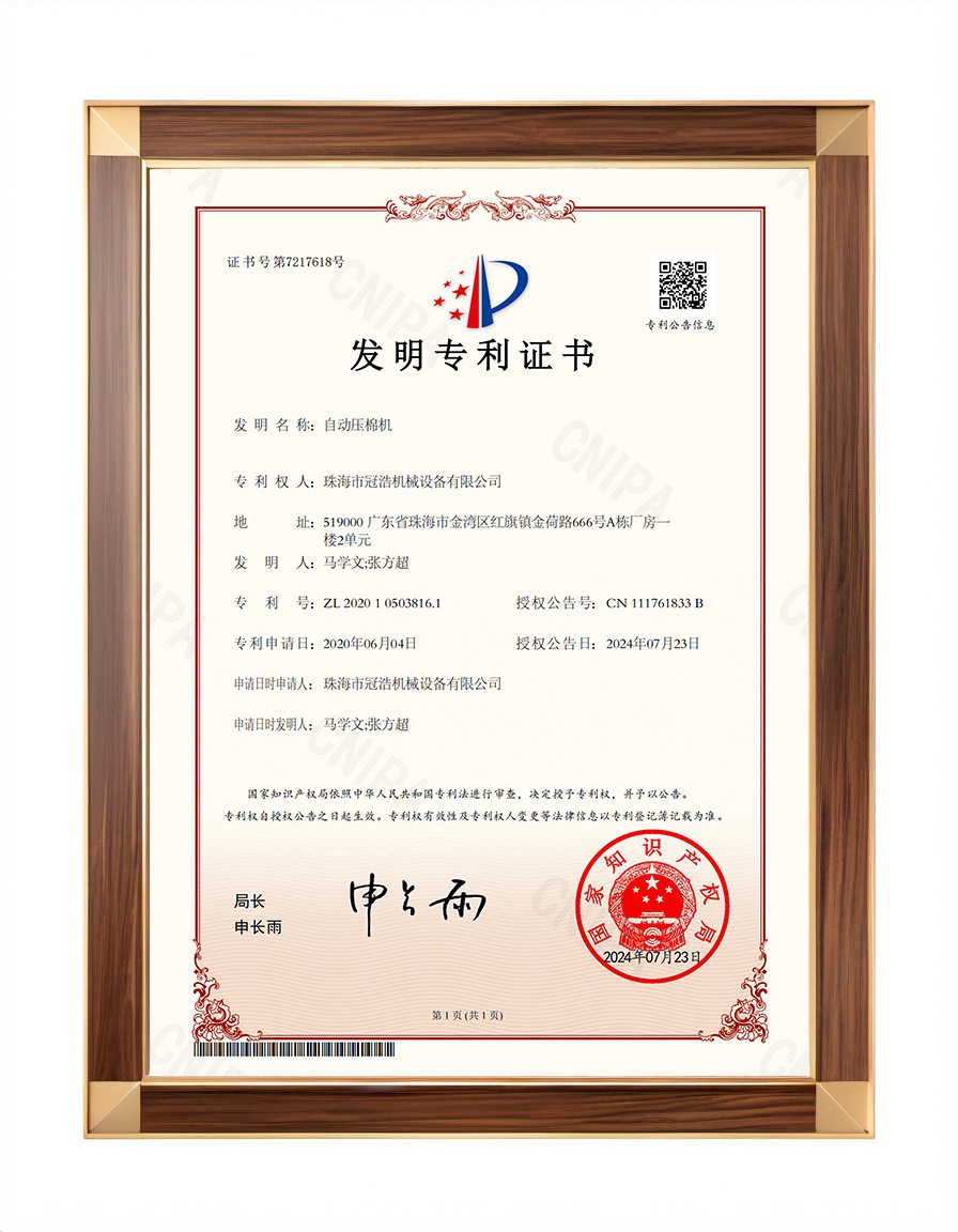 近日,冠浩公司宣布其自主研發(fā)的自動(dòng)壓棉機(jī)獲得了國(guó)家發(fā)明專利證書(shū)。這一創(chuàng)新成果標(biāo)志著公司在智能制造領(lǐng)域取得了重大突破,將對(duì)生物組培加工行業(yè)帶來(lái)深遠(yuǎn)影響。