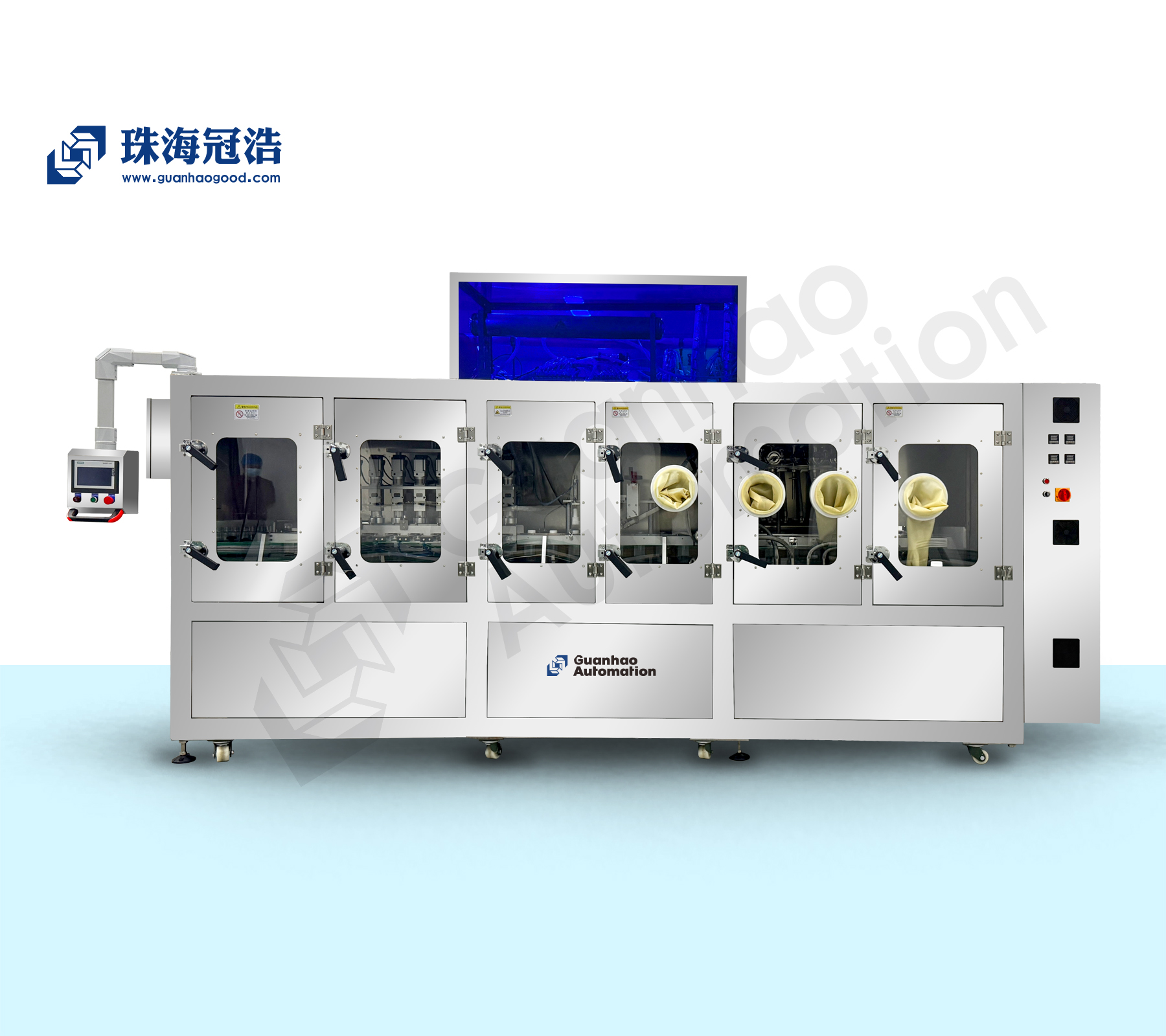 4. 機(jī)箱外罩采用304不銹鋼和有機(jī)玻璃組成,拼接處皆做密封處理,機(jī)箱上方由多組空氣凈化過濾機(jī)組成;